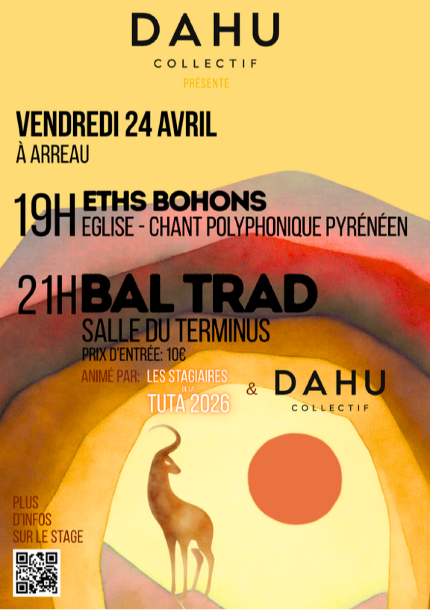Vendredi prochain, le Dahu collectif, vous propose d’assister à 19h, à l’église d’Arreau, au concert de chants Polyphoniques de « Eths Bohons ». Puis à 21h, à la salle du terminus, Le Dahu collectif organise un bal traditionnel, animé par les stagiaires de la TUTA. L’entrée au bal sera sur participation.