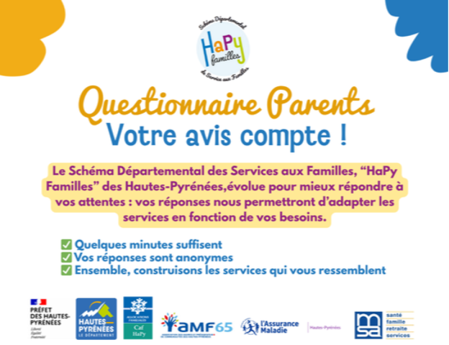 Le Schéma Départemental des Services aux Familles des Hautes-Pyrénées vise à élaborer une politique partagée de la petite enfance, de l’enfance, de la jeunesse, de la parentalité, de l’animation de la vie sociale ainsi que de l’accès aux droits. Afin de le faire évoluer, « HaPy Familles », le Département des Hautes-Pyrénées, la Préfecture et la Caf HaPy lancent une nouvelle consultation auprès des parents du territoire. L’objectif est d’adapter les services proposés aux familles à leurs besoins et à leurs attentes. Un questionnaire « Parents » est mis en ligne jusqu’au 31 janvier 2026, via le site des hautespyrenees.fr. Que vous soyez parent, professionnel du secteur, votre participation est précieuse.