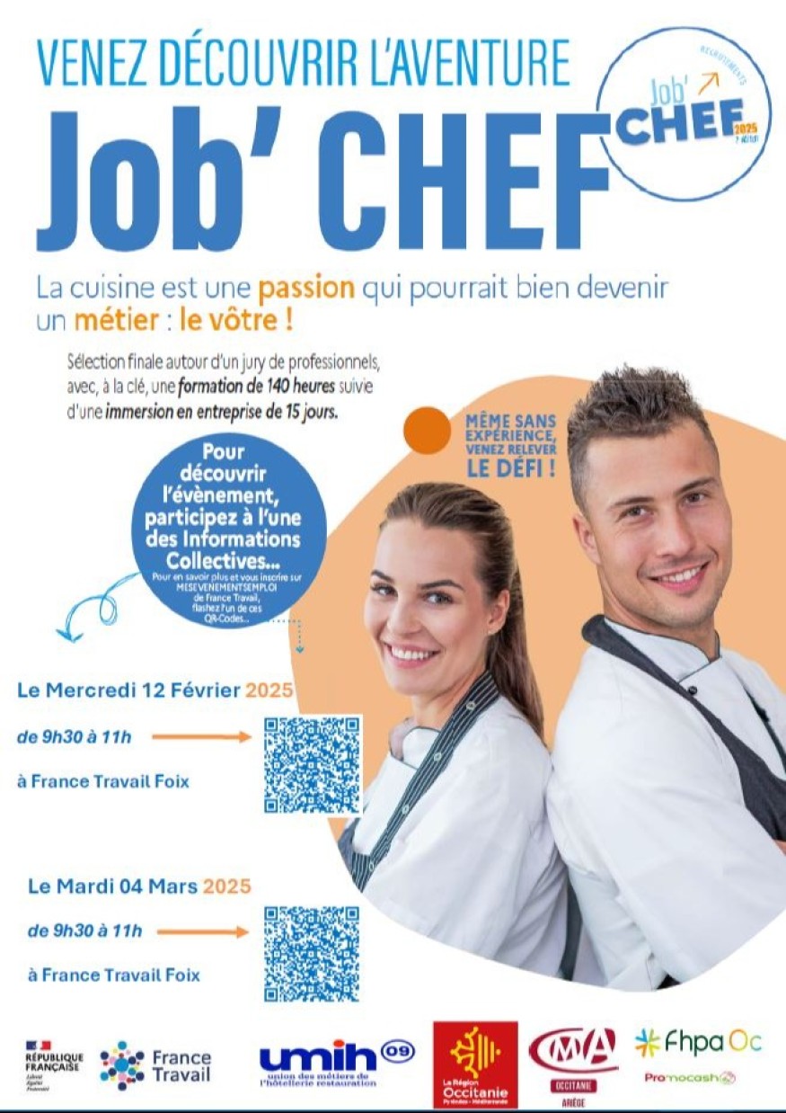 Le concours Job Chef aura lieu le lundi 16 mars, à Tarbes. Si vous souhaitez faire de votre passion pour la cuisine votre futur métier, cet événement est fait pour vous. À l’issue du concours, quel que soit votre classement, vous intégrerez une formation complétée par 15 jours de stage en entreprise sur le métier de commis de cuisine. L’inscription à la participation au concours Job Chef est obligatoire par votre présence à la réunion d’information, le jeudi 19 février à 10 h, à Séméac. Lors de cette réunion, on vous présentera le secteur de la restauration et le métier, le déroulé du concours ainsi que la formation proposée. Pour plus de renseignements, consultez mesevenementsemploi.francetravail.fr ou rendez-vous dans une agence France Travail.
